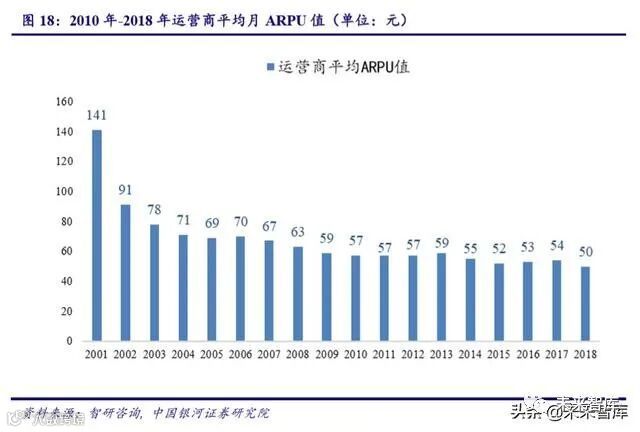 2G 市场初期,中国移动处于垄断地位,随着联通加入中国移动 ARPU 值开始逐步下 降,移动和联通共拓行业市场,ARPU 值保持稳定。2008 年年初期,中国电信收购中国联 通分拆的 C 网,3G 时代三大竞争格局正式成立,因为联通和电信的 3G 标准占有优势,使 得中国移动 ARPU 值降幅明显。2015 年初期,中国移动率先发力 4G 市场,ARPU 值有所 回落,中国联通和中国电信 ARPU 值较为稳定,总体看来,虽行业 ARPU 值总体整体下行, 但追究其原因是因为近年来三大运营商竞争激烈,追求用户增长而牺牲 ARPU 值,运营商 平均 ARPU 值保持在 50~60 左右。随着流量红利趋于尾声,业务增长将更依赖于用户价值 挖掘,因此我们认为未来长期来看 ARPU 值将趋于稳定甚至稳中有升。