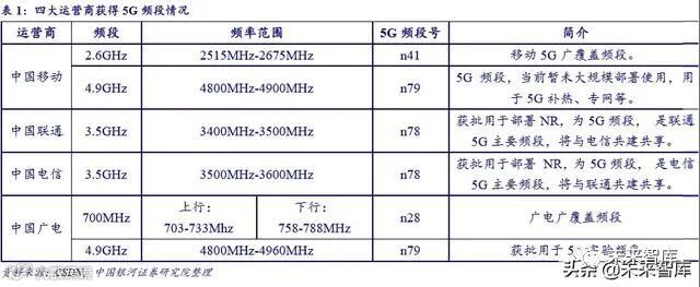 中国电信和中国联通取得 3.4GHz 和 3.6GHz 两个频段。在整个业内来看,主流运营商 用的是 3.5G 频段,虽然覆盖效果不如中国移动,但是好处是带宽大,产业链优势明显。