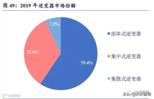 组串式逆变器依然占据主要地位。光伏逆变器一般分为三类:集中式、组串式和微型逆 变器。根据《中国光伏产业发展路线图(2019 版)》 ,2019 年光伏逆变器市场仍然主要以集中 式和组串式为主,集散式占比较小。其中,组串式逆变器市占率较 2018 年小幅下滑至 59.4%, 虽然集中式光伏电站中组串式逆变器使用占比升高,但分布式光伏市场占比下滑。集散式逆变 器的市场份额同比提升了 2 个百分点。