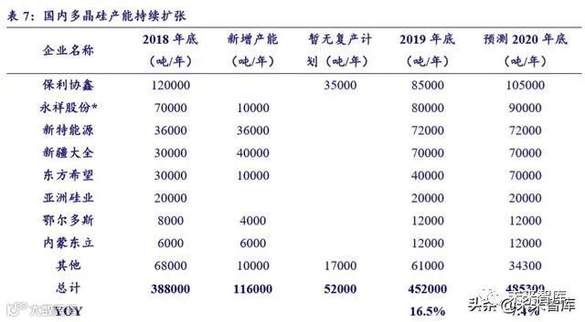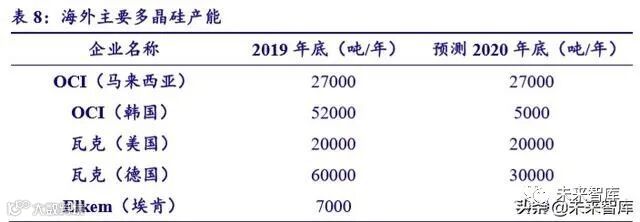 短期硅料价格有望企稳回升。根据硅业分会,我国 2019 年在产多晶硅企业数量减少至 13 家,总产能达到 45.2 万吨/年,同比增长 16.5%。展望 2020 年,从供应端看,国内多晶硅产量 短期内增量较少。从需求端看,下游硅片大举扩张激发了高品质硅料需求。我们预计,在新产 能未投产之前,叠加疫情因素,硅料价格短期内有望触底回升。从全年维度看,硅料价格主要 取决于国内外新增产能释放情况,以及旧产能退出进度(海外以 OCI 和瓦克为代表)。