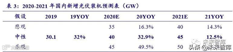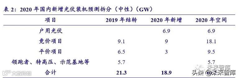 2020 年国内新增光伏装机有望达到 40GW。展望 2020 年,我们认为国内光伏竞价项目准 备时间更充分,将提升落地效率,同时平价项目也比 2019 年更成熟,整体需求或全面向好。我们预测:1)新增户用光伏 6.9GW;2)2019 年竞价项目结转 9.1GW;3)新增竞价项目落 地 9GW;4)2019 年平价项目结转 6.5GW;5)新增平价项目 3GW;6)2019 年领跑者、特高 压、示范基地等结转 5.7GW;以上合计约 40GW,同比提升 33%。