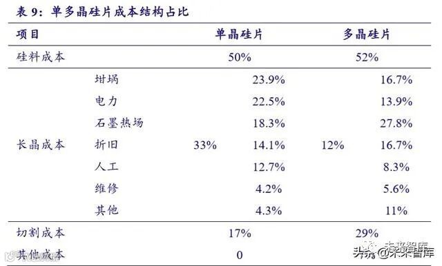 硅片成本大致可分为硅料成本和非硅成本。硅片生产成本的 50%-60%主要由硅料价格决 定,硅片厂商往往可以通过提高切割的出片量来摊薄成本。非硅成本包括长晶过程中设备、电 力、人工、特气的耗费,以及切片过程中金刚线线材损耗等其他成本。