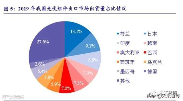 中国是全球光伏组件最大出口国,主要销往欧洲市场。随着光伏发电成本不断下降,新 兴市场不断涌现,自 2017 年开始,我国光伏组件出口占比稳步增长。2018 年 8 月,欧盟正式 取消中国进口光伏产品双反和 MIP(最低进口价格),因此欧洲需求增加,一跃成为我国组件 出口的主要市场。根据智新咨询,2019 年荷兰、日本、印度排名前三,出货量分别达到 8.35GW/5.77GW/5.58GW,出口额分别达到 21.17 亿美元/16.01 亿美元/12.41 亿美元。