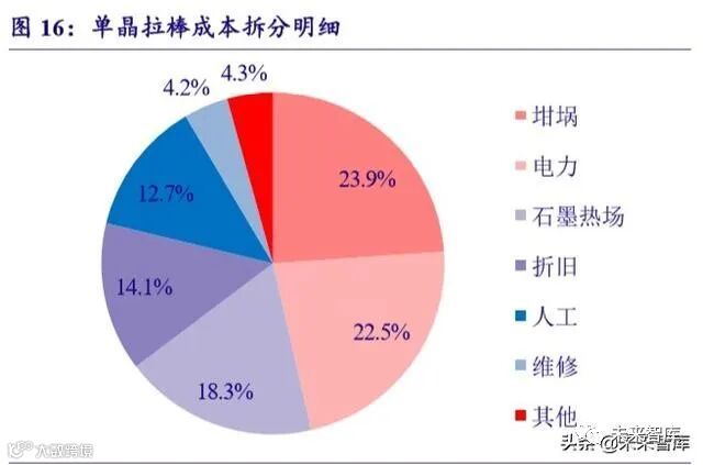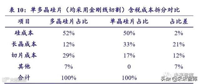 长晶环节中的单炉产出量和电费为重要降本点。对比长晶环节成本占比,单晶硅片比多 晶硅片高出约 21%,单晶硅片降本仍存空间,主要是通过以下几种途径:1)改进拉棒技术提 高单炉产出,采用连续拉棒技术摊薄损耗和设备折旧;2)将产线建在低电价地区以降低电费。