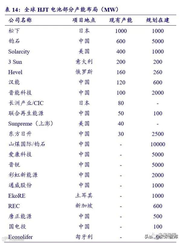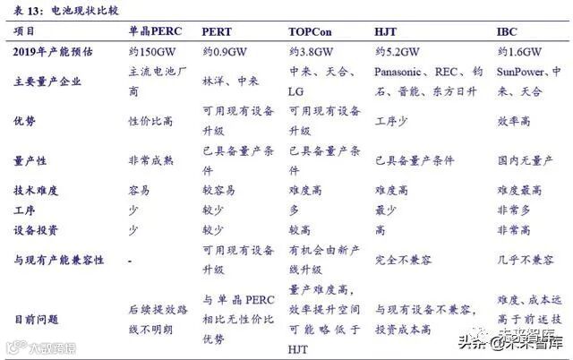 多家龙头已启动布局,HJT、TOPCon 产能有望快速提升。 (1)TOPCon:因产线可直接 升级,部分原布局 PERT 产线的厂商改走 TOPCon 路线。根据 EnergyTrend,中来股份目前已 拥有 1.5GW 产能,2019-2021 年或将交付总计 5GW。天合光能宣布 TOPCon 实现量产。林洋 能源、晶科能源也有布局。TOPCon 技术成为 N 型高效电池产业化的切入点。(2)HJT:目前 行业内关注并研究异质结电池技术的企业有日本松下、长洲、美国 Solarcity、Sunpreme、中国 钧石、晋能、通威等十余家企业,部分企业已实现量产。