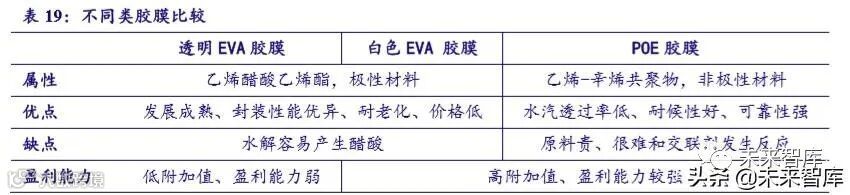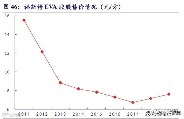新型胶膜有望拉动毛利率回升。光伏胶膜主要包括透明 EVA、白色 EVA 、POE 胶膜等。福斯特公告显示,目前使用最广泛的是透明 EVA 胶膜,2018 年市占率达到 80%以上。POE 胶膜最大的优势是低水汽透过率和高体积电阻率,保证了组件在高温高湿环境下运行的安全性 以及较强的耐老化性。我们人为,随着开发日渐成熟,以 POE 为代表的新型胶膜有望得到市 场的广泛认可,行业龙头有望通过产品结构的调整提升胶膜业务整体的毛利率水平。
