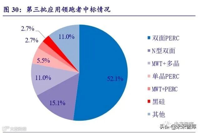 PERC 仍存改进空间,“SE+双面”路径清晰。双面 PERC 技术将全铝背场印刷改为铝栅线 印刷,就能使背面发电,可以节省铝浆,降低成本。从第三批应用领跑者中标结果看,双面 PERC 占比已高达 52.1%。另外,SE(选择性发射极)技术只需新增一台激光掺杂设备,能将PERC 效率提升至 22%,且与双面 PERC 兼容,有望成为未来 PERC 的升级方向。