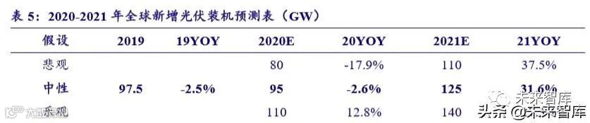 2020 年全球新增装机或面临下滑。我们认为,2020 年国内光伏需求回暖,海外需求影响 较大。整体来看,在中性假设下,我们预计 2020 年全球新增光伏装机有望达到 95GW(国内 40GW、海外 55GW),同比下滑 2.5%。然而,海外需求只会递延不会消失,组件价格下滑的 经济性刺激作用仍在,中长期需求向上的势头仍然强劲。