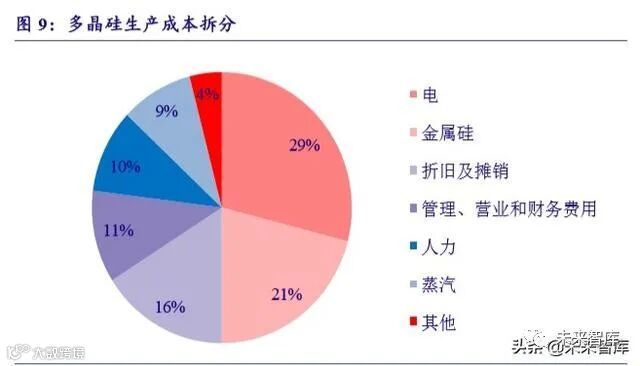 因电价和产线不同,硅料成本差异明显。电费是多晶硅生产成本中最大组成部分,占比 约 29%。根据所处地电价和厂商新旧产线差异,当前多晶硅料产能大致可分为“低电价区新 产线”、“低电价区技改产线”、“高电价区旧产线”、“国外产能”四类。根据太阳能光伏 网,新产线单位产出耗电仅约 58kwh/kg,因此新产线的成本为全行业最低水平。