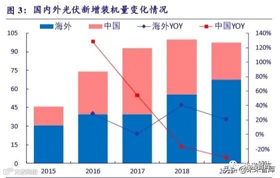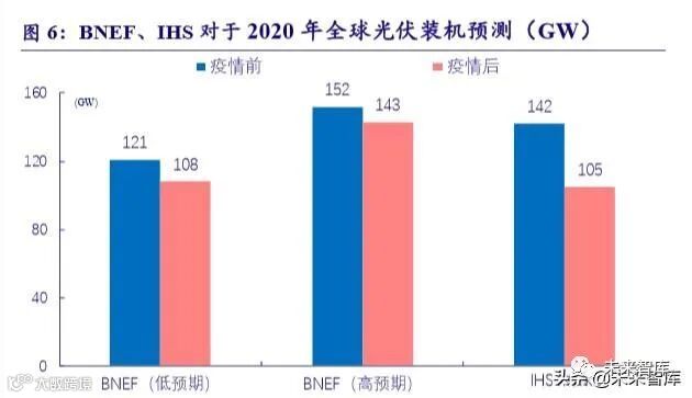 BNEF、IHS 下调预测,二季度面临大考。由于海外新冠疫情超出市场预期,BNEF、HIS 等机构纷纷调低 2020 年全球光伏装机预测,例如 IHS Markit,根据 COVID-19 的影响发布了 新的2020 年太阳能装机预测,到 2020年全球新增光伏装机规模将达到 105GW(原为 142GW)。我们认为,2020 年海外需求承压或不可避免,以目前的情况来看,我们预计 2020 年海外需求 为 55 GW(同比- 18.4%),二季度将面临考验,随后或逐步企稳。