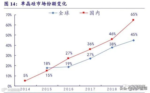 大硅片已成趋势。为了提升产品竞争力,企业纷纷发布 158.75mm、161.7mm、163mm、 166mm 以及 210mm 等大尺寸硅片。2019 年 8 月,中环股份发布 12 英寸大尺寸硅片(面积 44096mm2,210X210mm,对角 295mm),其具备更高的转换效率、更低的单瓦成本、更低的 LCOE,是产品创新上的一次重要突破。