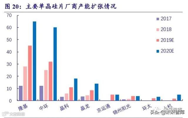 龙头产能大举扩张,2020 年毛利率承压。根据 CPIA,2019 年全国硅片产量约为 134.6GW, 同比增长 25.7%。截至 2019 年底,产量超 2GW 的企业有 9 家,产量占比达 85.5%,全球前十 大生产企业均位居中国。根据 solarzoom 不完全统计,2020 年主流单晶硅片厂商合计产能的同 比增幅或将超过 60%。我们认为,2020 年单晶硅片市场的供需或将整体偏宽松,行业毛利率 在短期内面临较大压力。