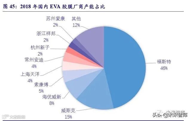 寡头垄断格局基本形成。光伏封装胶膜是组件环节的必需品,用于粘结电池片与玻璃或 背板。根据嘉肯咨询,2018 年国内 EVA 胶膜产能达 13.51 亿平米(占全球约 72%) ,主要厂商 有福斯特、海优威新材料、威斯克等,国内前三大产商产能占比高达 70%。由于行业技术壁 垒较高、客户黏性较强,行业难有新进入者。