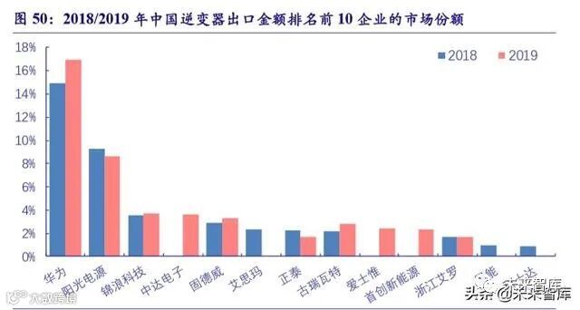 华为、阳光电源、锦浪科技稳居出口前三。根据光伏们,2019 年中国的光伏逆变器出口 量约为 3155.47 万台,总金额近 29 亿美元,前 20 家公司的占比超过了 50%。其中,华为、阳 光电源、锦浪科技位列 2019 年出口逆变器企业前三名,出口额合计占比从 2018 年的 27.68% 提高到了 2019 年的 29.35%,集中度进一步提升。