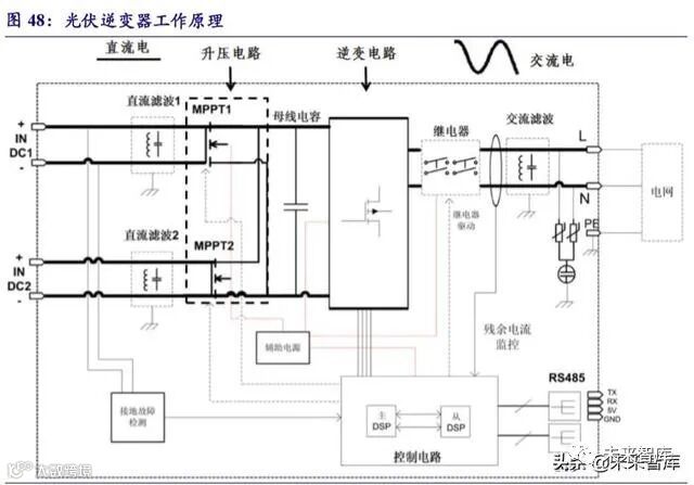 光伏逆变器是太阳能光伏系统的心脏,其主要功能是将电池组件产生的直流电转化为交流 电,并入电网或供负载使用,属于光伏发电系统的核心设备。