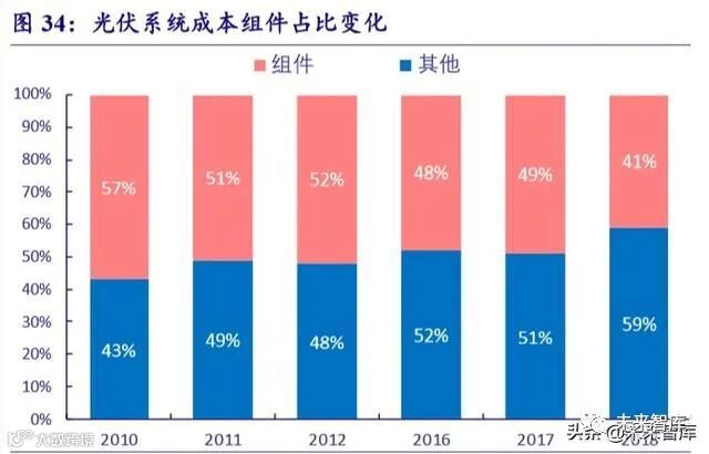 成本降幅显著,毛利率持续受挤压。在光伏产业链中,组件处于封装环节,其技术、规 模壁垒相对较低,行业参与者众多。在电站系统成本中,组件成本占比逐年下移,从 2010 年 的 57%降至 2018 年的 41%。2015 年以来,随着产能不断扩张,龙头公司营收规模大幅提升, 但多以降价让利为手段,毛利率持续受挤压。