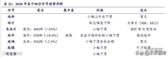 价格:各环节价格均承压,玻璃支撑最强,硅片降价空间最大。我们预计 2020 年光伏整 体需求略有回落,产能仍在加大,各环节价格均有压力。其中,以全年维度来看,硅料短期面 临国内产能爬坡和国外产能退出,价格或小幅回升,未来随着优质产能放量,价格或小幅下滑;硅片大幅扩产,让利不可避免;电池片价格已经触底,由于技术迭代,新增产能存在不确定性, 价格或迎小幅下滑;组件订单按惯例提前锁价(3-6 个月),一定程度上可以对冲疫情影响;玻璃竞争格局最优,价格支撑力度较强;胶膜、逆变器价格预计小幅下滑。