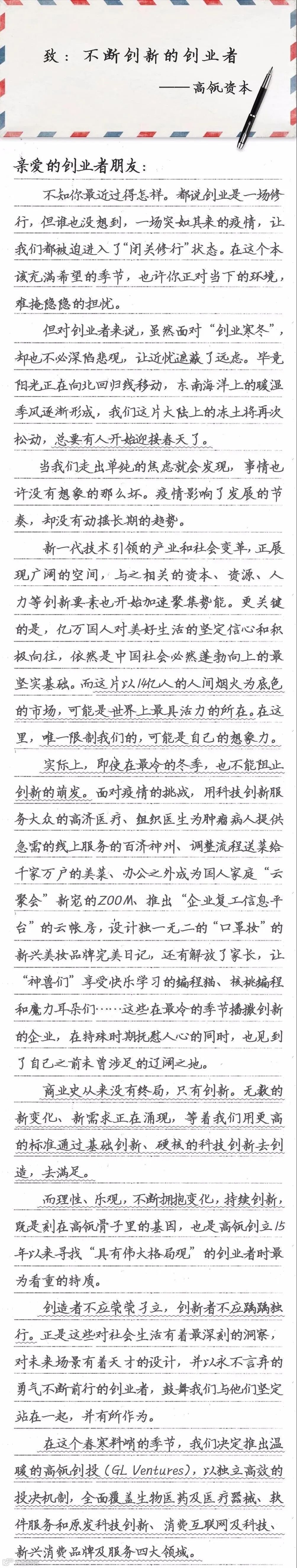 2月24日,高瓴资本发布了一封“致创业者的一封信”,正式宣布成立专注于投资早期创业公司的高瓴创投,主要专注于生物医药及医疗器械、软件服务和原发科技创新、消费互联网及科技、新兴消费品牌及服务四大领域的风险投资。