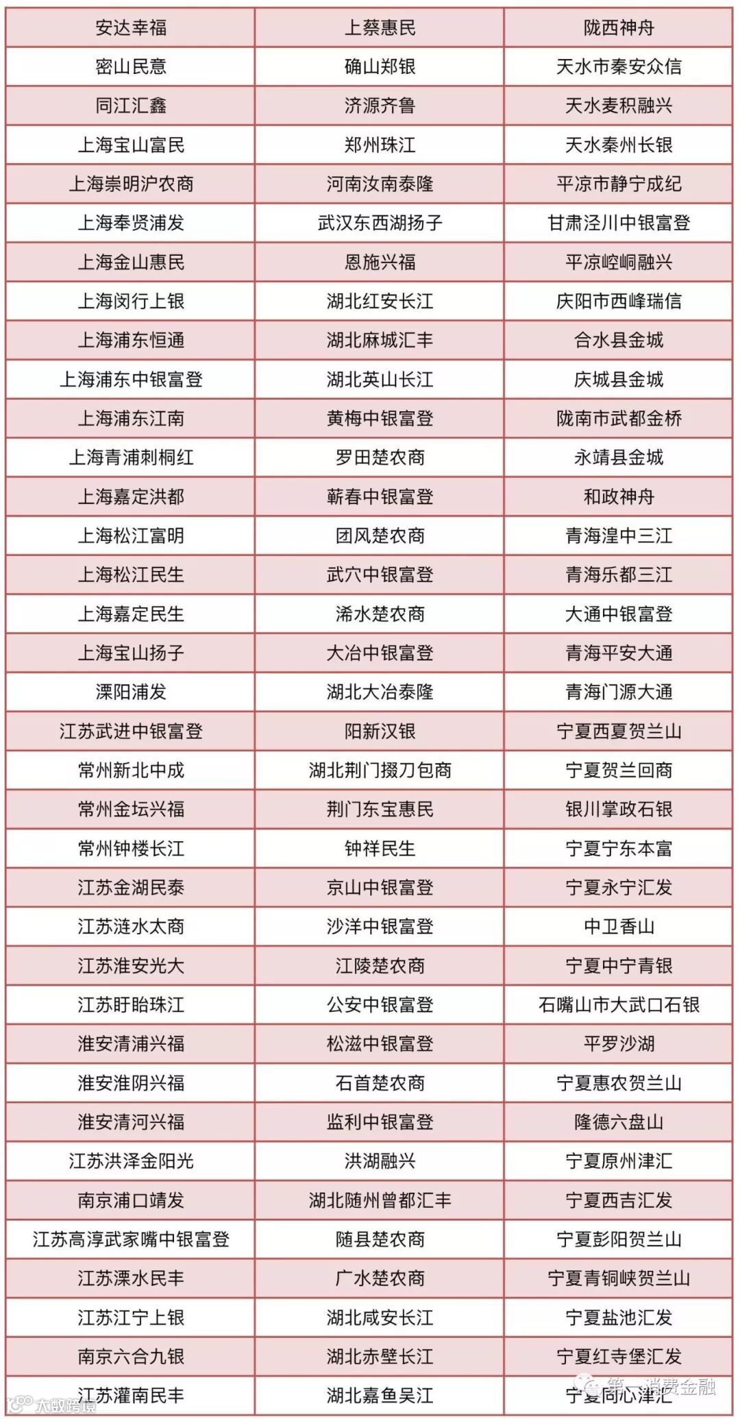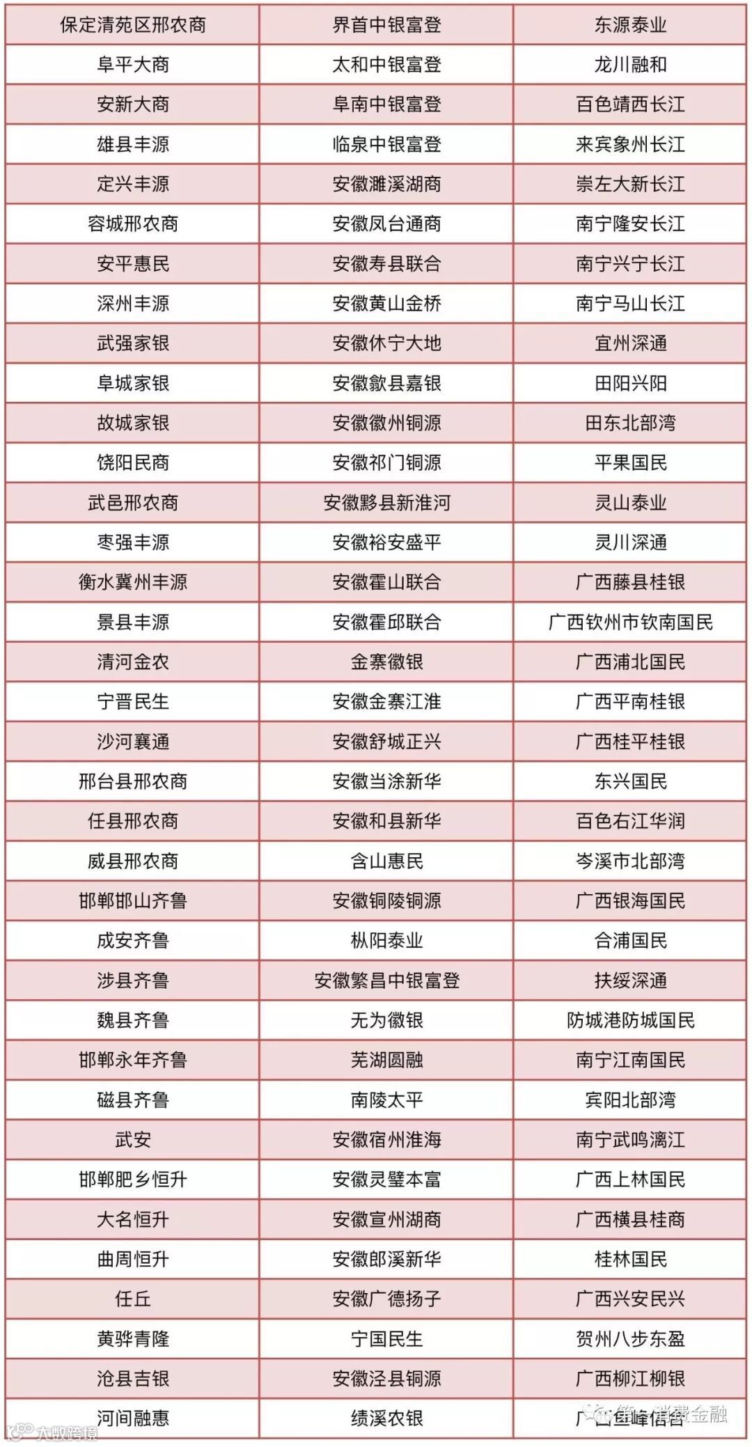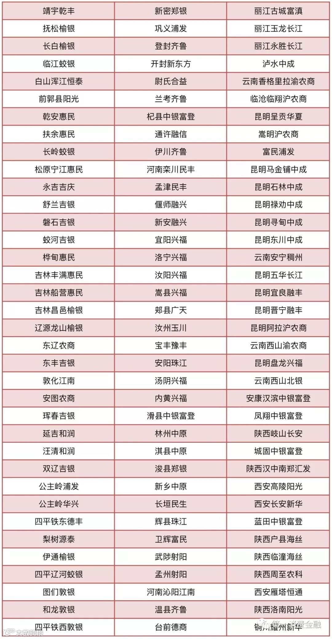农村合作银行30家:甘肃榆中农村合作银行、陇南武都农村合作银行、甘肃宁县农村合作银行、天水麦积农村合作银行、天水秦州农村合作银行、广西百色右江农村合作银行、广西桂林漓江农村合作银行、广西贺州桂东农村合作银行、广西来宾桂中农村合作银行、广西荔浦农村合作银行、广西灵川农村合作银行、广西柳城农村合作银行、广西柳江农村合作银行、广西平果农村合作银行、广西全州农村合作银行、广西象州农村合作银行、广西宜州农村合作银行、广西永福农村合作银行、广西平乐农村合作银行、广西兴安农村合作银行、广西阳朔农村合作银行、石家庄汇融农村合作银行、二连浩特农村合作银行、通辽奈曼农村合作银行、锡林浩特农村合作银行、陕西富县农村合作银行、陕西吴起农村合作银行、新疆石河子农村合作银行、昆明官渡农村合作银行、浙江绍兴恒信农村合作银行。