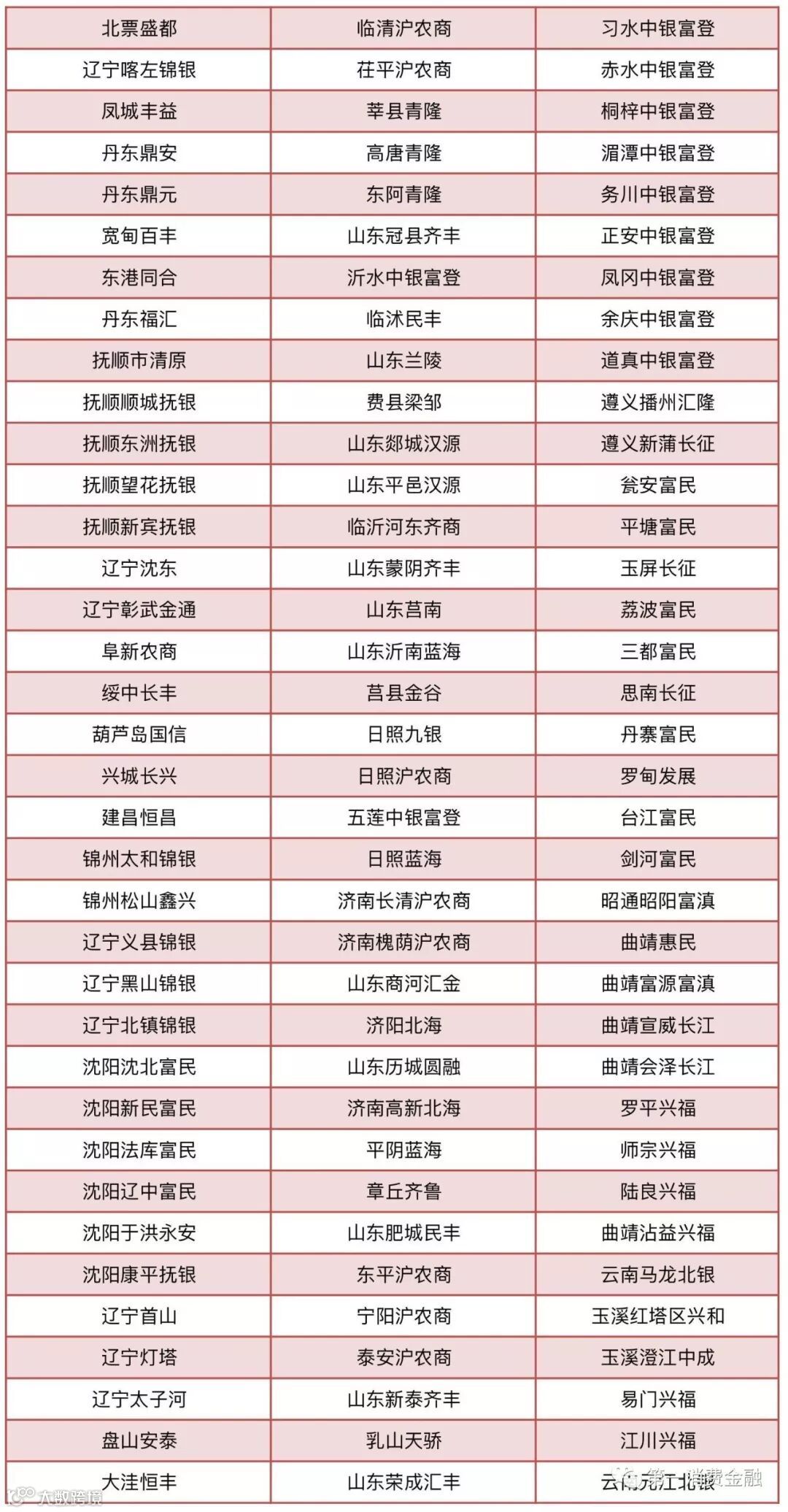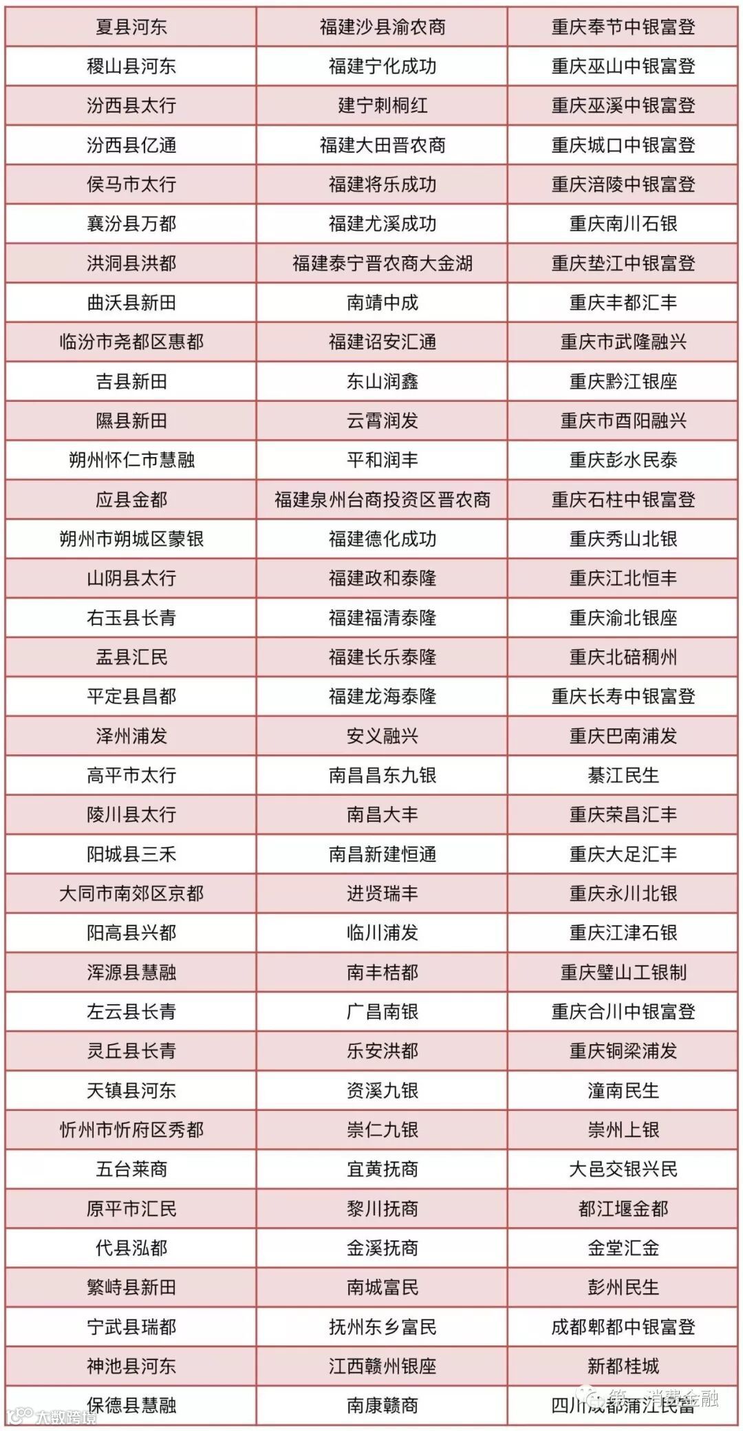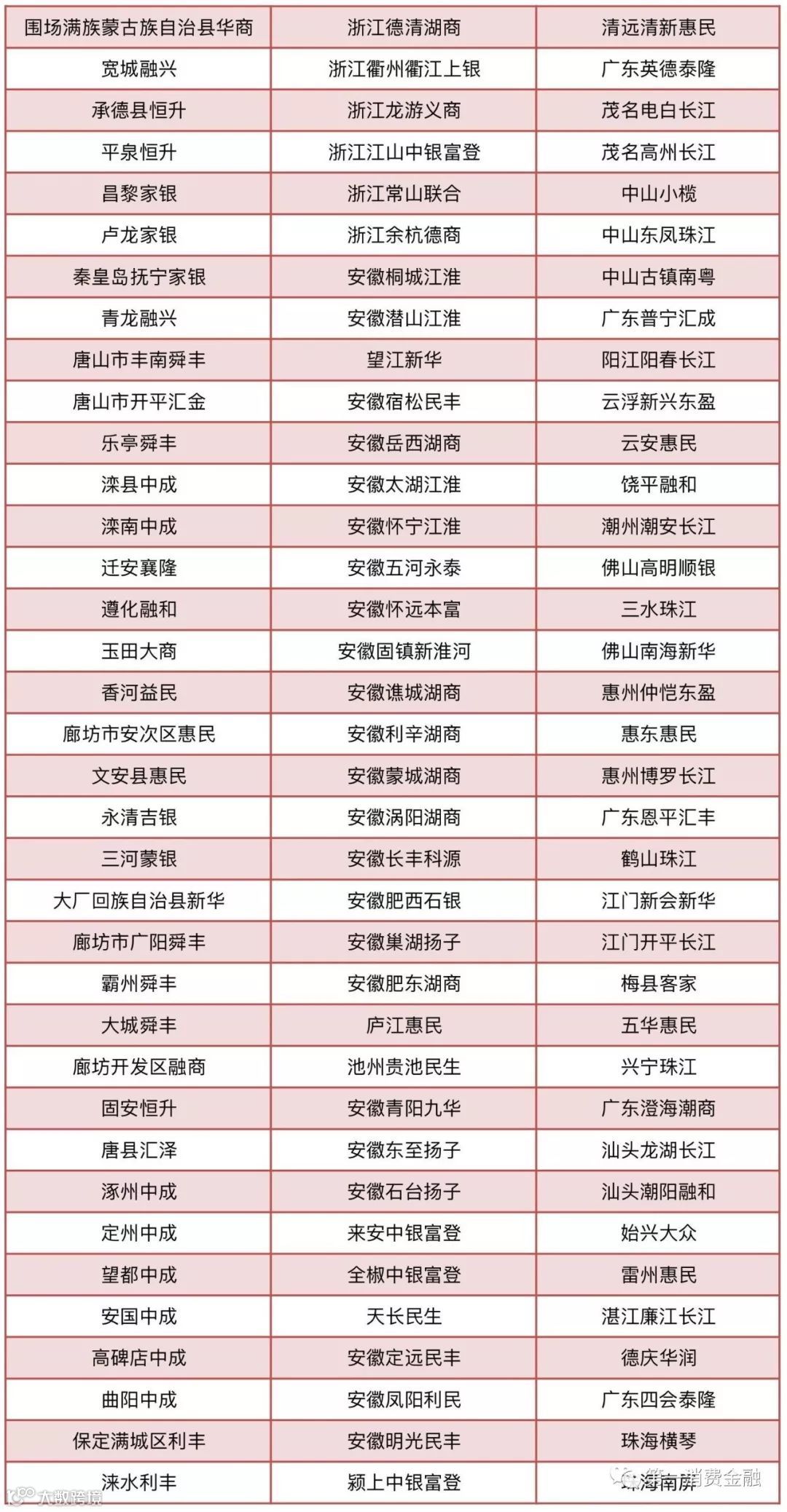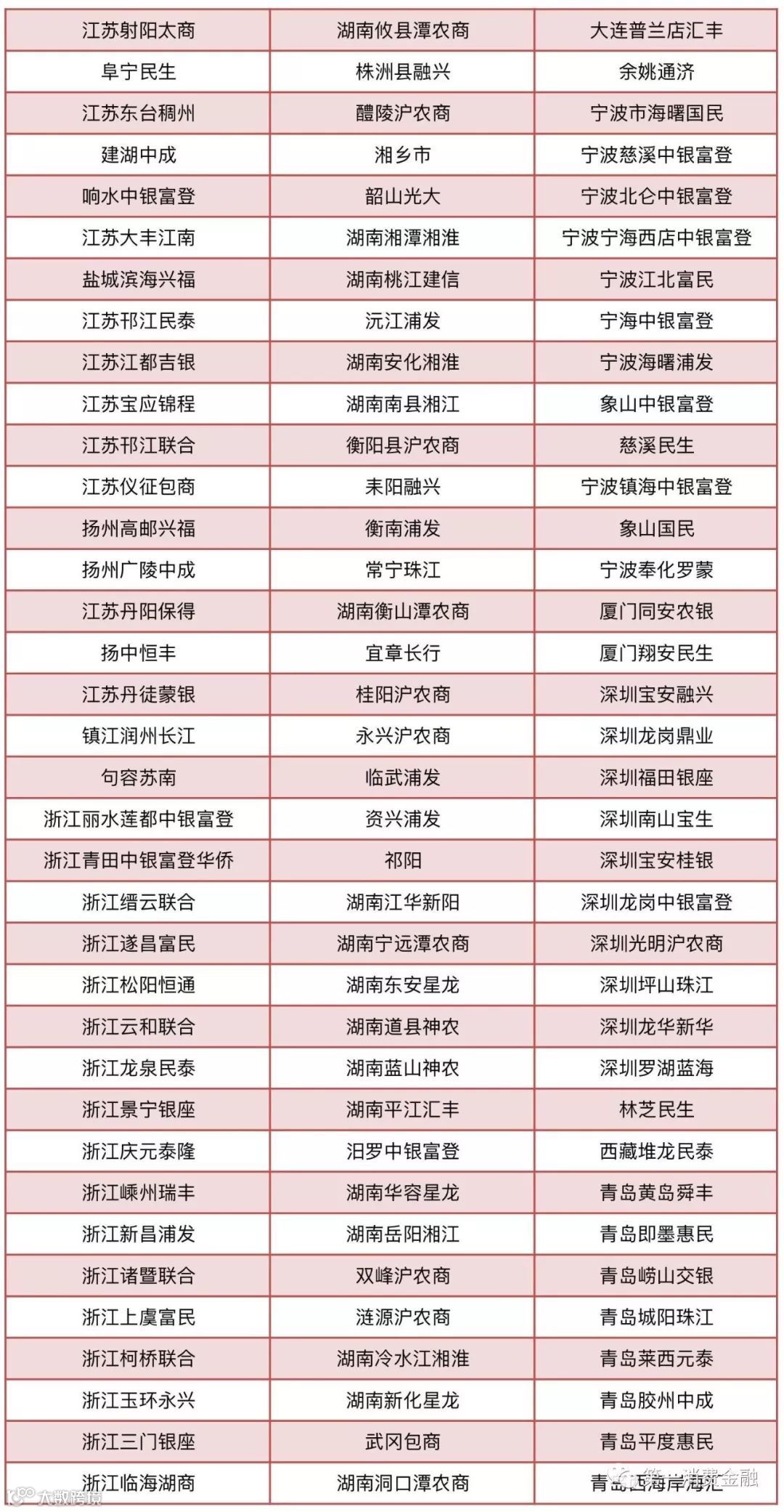 农村合作银行30家:甘肃榆中农村合作银行、陇南武都农村合作银行、甘肃宁县农村合作银行、天水麦积农村合作银行、天水秦州农村合作银行、广西百色右江农村合作银行、广西桂林漓江农村合作银行、广西贺州桂东农村合作银行、广西来宾桂中农村合作银行、广西荔浦农村合作银行、广西灵川农村合作银行、广西柳城农村合作银行、广西柳江农村合作银行、广西平果农村合作银行、广西全州农村合作银行、广西象州农村合作银行、广西宜州农村合作银行、广西永福农村合作银行、广西平乐农村合作银行、广西兴安农村合作银行、广西阳朔农村合作银行、石家庄汇融农村合作银行、二连浩特农村合作银行、通辽奈曼农村合作银行、锡林浩特农村合作银行、陕西富县农村合作银行、陕西吴起农村合作银行、新疆石河子农村合作银行、昆明官渡农村合作银行、浙江绍兴恒信农村合作银行。