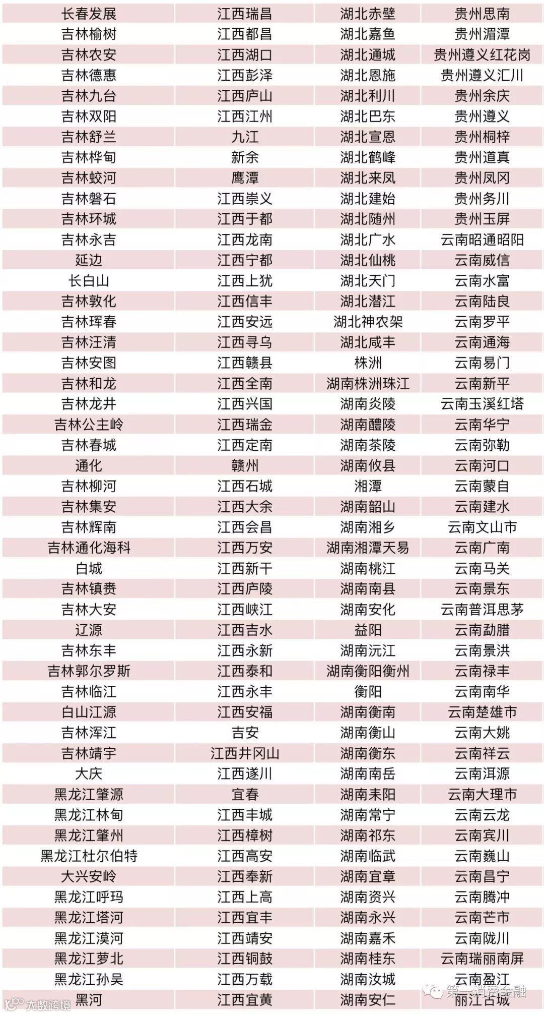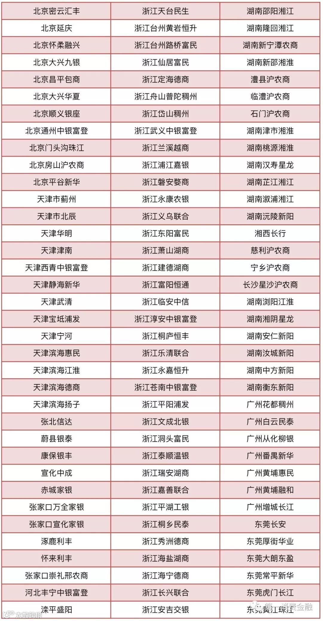 贷款公司13家:天津市静海区兴农贷款有限责任公司、天津市宝坻区兴农贷款有限责任公司、天津市宝坻区兴农贷款有限责任公司、天津市蓟州区兴农贷款有限责任公司、天津市宁河区兴农贷款有限责任公司、天津市武清区兴农贷款有限责任公司、吉林德惠长银贷款公司、开化通济贷款有限责任公司、湖北咸宁赤壁花旗贷款有限责任公司、湖北荆州公安花旗贷款有限责任公司、重庆北碚花旗贷款有限责任公司、四川平武富民贷款有限责任公司、四川仪陇惠民贷款有限责任公司、大连瓦房店花旗贷款有限责任公司。