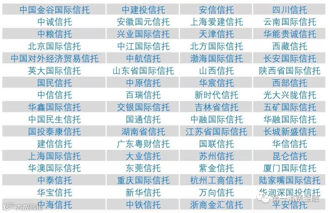 信托68家:信托完整名单如下表格所示。请注意接下来所有名单中的公司名称均为简称,比如"渤海国际信托股份有限公司"简写为“渤海”。