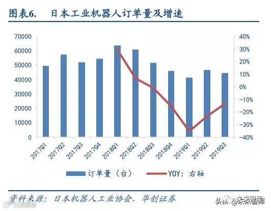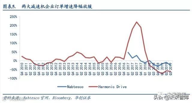 两大减速器公司订单增速降幅收窄。减速器作为工业机器人最重要的上游零部件,占据工业机器人总成本的 35%, 并且全球市场份额的 75%被日本纳博特斯克(Nabtesco)和日本哈默纳科(Harmonic Drive)两个公司所占据。这两 个公司的订单数据对机器人行业的景气度具有一定的预示作用。从两家订单增速可以看到,相继于 2018Q4 和 2019Q1 出现拐点,降幅收窄。