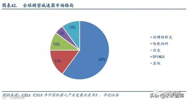 精密减速器制造因其对材料、设备、工艺等多个环节都有严格要求,而造成极高的投资和技术壁垒。正因如此,当 前全球工业机器人减速器市场呈寡头垄断格局,行业集中度较高。其中,日本纳博特斯克(Nabtesco)是生产 RV 减 速器的世界巨头,约占 60%的全球减速器市场份额,在中/重负荷工业机器人领域,其 RV 减速器产品在全球 RV 减 速器市场占有率更是高达 90%以上。哈默纳科(Harmonic)则在谐波减速器领域拥有绝对优势,约占 15%的全球减 速器市场份额。除此之外,住友市场份额也有 10%,旗下产品包括 FINECYCLO 系列零齿隙精密摆线减速器等。全 球减速器市场呈现出以日本企业一派独大的高度集中化局面。
