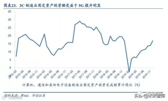 该需求在 2019 年已经有所体现。受益于 5G 渗透率的逐步提升,从 2019 年 3 月份开始,计算机、通信以及其他电 子设备等制造业固定资产投资逐步回暖,计算机、通信和其他电子设备制造业固定资产投资完成额累计同比增速已 提升至 16.8%。2020 年 5G 建设将进一步加速,相应的设备需求量将显著增加,计算机、通信及其他电子设备固定 资产投资有望进一步提升。