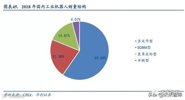 工业机器人本体按照坐标形式可分为直角坐标型、SCARA 型、多关节型、并联型等。在各种类型工业机器人中,多 关节型与 SCARA 型用量最大,应用领域最为广泛。从市场结构看,多关节机器人和 SCARA 机器人占工业机器人销 量的主要份额,其中多关节机器人的销量占比为 59.64%, SCARA 机器人的销量占比为 21.48%。