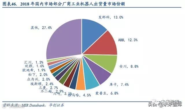 另外,市场份额仍较为分散且处于价值链偏低端,在汽车和 3C 等对于精度和稳定性要求比较高的领域,大部分市 场份额都是被外资品牌占据,我国大部分本体都是集中码垛、上下料以及搬运等相对低端的领域。根据 MIR Databank 数据,2018 年我国机器人自主品牌销量占比约为 27.72%。而根据中国机器人产业联盟数据,在主要下游应用领域电 气电子设备和器材制造业和汽车行业中自主品牌分别占比 30.1%和 13.8%,均有非常大的提升空间。