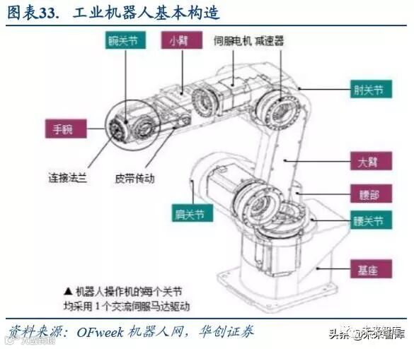 工业机器人产业链包括上游核心零部件、中游机器人本体和下游集成应用三部分。上游是控制器、伺服电机、减速 器、传感器、 末端执行器等零部件的生产厂商, 控制器、伺服电机和减速器是工业机器人三大核心零部件;中游 是本体生产商,负责工业机器人本体的组装和集成,即机座和执行机构,包括手臂、腕部等,部分机器人本体还包 括行走结构;下游是集成应用商,负责根据不同的应用场景和用途对工业机器人进行有针对性地系统集成和软件二 次开发。