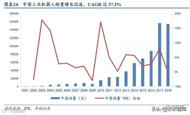 根据 IFR 公布的工业机器人销量数据,2018 年中国工业机器人销量达 15.4 万台,同比增加 10.66%,同比略微减少 1.37%,销售额 54.2 亿美元(378 亿人民币)。近几年来中国市场已经成为工业机器人的第一大市场,贡献了超过 30%的全球工业机器人销量。而国内市场销量增长迅速,从 2001 年的 700 台,到 2018 年的 15.4 万台,年均复合增 长率达 37.3%。