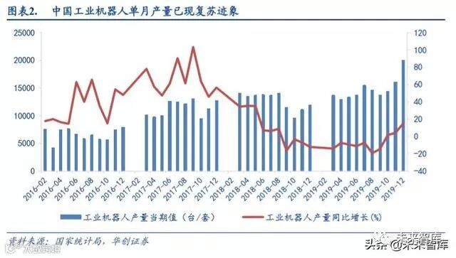根据国家统计局公布,2019 年 12 月国内工业机器人产量 20014 台,同比增长 15.3%。国内工业机器人产量从 2018 年 9 月开始,受到宏观经济下行的影响,经历了连续 13 个月的下滑,自 2019 年 10 月转正,随后增速逐月增加。受 宏观政策的影响,下游制造业有所复苏,其对工业机器人的需求也恢复到正常水平,国内机器人行业转暖信号已经 浮现。