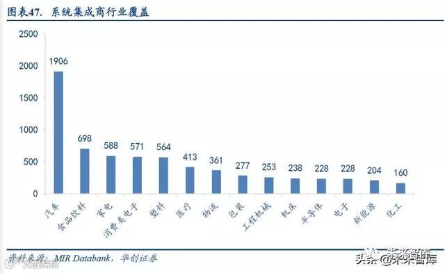 MIR Databank对7888家系统集成商中的5627家厂商进行了行业覆盖分析,其中1906家覆盖汽车行业,占比33.9%;698 家覆盖食品饮料行业,占比 12.4%;588 家覆盖家电行业,占比 10.4%;413 家覆盖医疗行业,占比 7.3%;571 家覆盖消费类电子行业,占比 10.1%(有些厂商会涉及覆盖多个行业)。