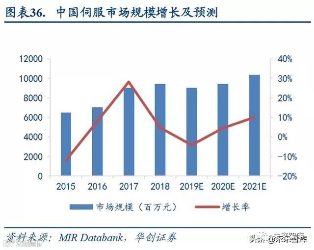 根据《伺服与运动控制》的统计与预测,2018 年年底伺服市场规模 93.8 亿元,同比增长 4.7%。较 2015 年底,复合 年增长率达 13.2%,预计 2021 年中国伺服市场将突破 100 亿元。伺服电机在工业自动化中发挥着重要作用,广泛用 于电子设备制造、工业机器人、机床、包装机械、印刷机械等多个领域。根据《伺服与运动控制》的统计,2018 年 机器人占伺服系统下游应用的 9.3%。