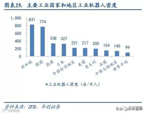 我国工业机器人密度与发达国家相比还有较大的提升空间。根据 IFR 公布的数据,2018 年工业机器人密度(每万名 制造业员工拥有的机器人数量)最高的是国家是新加坡,达到 831 台/万人,其次是韩国,达到 774 台/万人,德国、 日本以及美国等发达国家工业机器人密度也均在 200 台/万人以上。而中国是 140 台/万人,略高于全球平均水平。作为一个制造业大国,对标其他发达国家,我国工业机器人密度还有较大的提升空间。随着《中国制造 2025》国家 战略的稳步实施,国内制造业转型升级步伐将逐步加快,机器人密度将大幅增加,假设达到日本的水平,则我国工 业机器人是一个千亿级别的市场,未来发展潜力巨大。