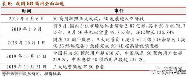 2019 年 6 月 6 日,工信部向中国移动、中国联通、中国电信这三大运营商,以及中国 广电 4 家企业正式发放 5G 牌照,牌照的发放标志着 5G 商用开始,中国正式进入 5G 时代。我国 5G 商业应用全面加速。