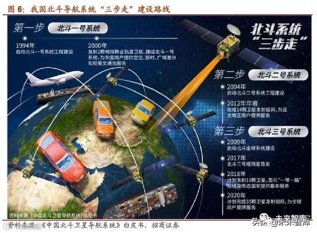 中国高度重视北斗系统建设发展,20 世纪 80 年代开始探索适合国情 的卫星导航系 统发展道路,形成了“三步走”发展战略:2000 年,建成北斗一号系统,向中国提供 服务;2012 年,建成北斗二号系统,向亚太地区 提供服务;2020 年,将建成北斗三 号系统,向全球提供服务。计划 2035 年,以北斗系统为核心,建设完善更加泛在、 更加融合、更加智能的国家综合定位导航授时体系。