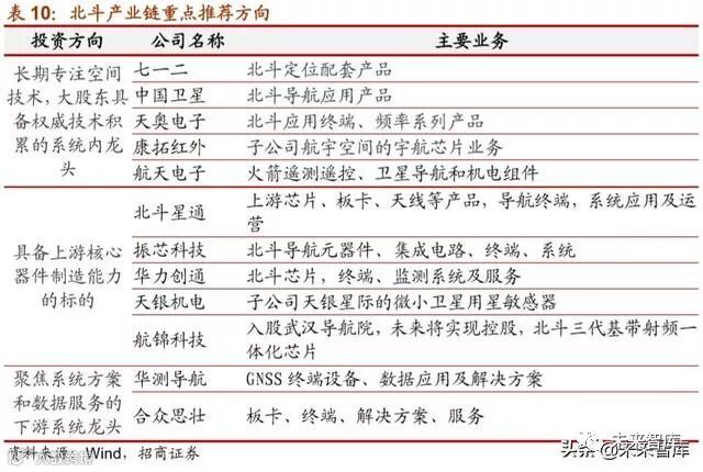 预计在 2020 年 6 月前,我国将发射两颗北斗三号地球静止轨道卫星,全面建成北斗三 号系统,为全球提供更优质服务,届时将为全球用户提供更完善的卫星导航服务。同时 随着 2020 年,我国 5G 商业进入快速增长期,北斗+5G 的融合将带来新业态,推动北斗 从行业应用进入大众生活,打开下游巨大的市场空间。也将带动产业链上的上市公司进 入重要发展期。建议关注以下几个方向: