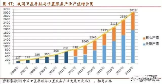 近年来,我国卫星导航与位置服务产业规模持续扩大,产值稳步增长,保持了良好的发展 态势。2018 年我国卫星导航与位置服务产业总体产值达到 3016 亿元人民币,较 2017 年 增长 18.3%其中, 与卫星导航技术研发和应用直接相关的,包括芯片、器件、算法、软 件、导航数据、终端设备、基础设施等在内的产业核心产值达到 1069 亿元人民币。在 总产值中占比为 35.44%,北斗对产业核心产值的贡献率已达到 80%;包括与定位导航授 时应用相关的其他各种数据及软件产品、各类集成应用系统、基于位置信息的运营服务 业务等在内的,由卫星导航衍生带动形成的关联产值达到 1947 亿元人民币。