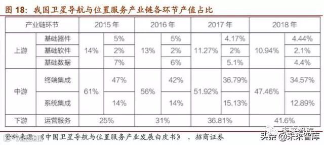 由于芯片和终端价格仍保持在较低水平,产业链上游和中游的产值占比分别为10.94%和 47.46%,仍呈下降趋势。随着我国北斗行业应用和大众应用逐步进入服务化阶段,各种类 型的位置服务公共平台大量出现和智能终端的应用普及,有力推动了产业链下游运营服 务收入的快速增长,产业链下游产值占比已经上升到 41.6%。2018 年,卫星导航领域技术 创新非常活跃,相关企业针对北斗产业链或产品链中关键节点的技术,如芯片、增强系 统等加快专利布局,并有意识地在技术空白点上进行专利挖掘。除了自主创新外,企业 还通过专利许可和转让等方式,获取了一批与北斗产业发展相关、围绕未来发展重点进 行布局的其他技术领域专利,形成配套专利组合。截至 2018 年底,我国卫星导航专利申 请累计总量已超过 6 万件,保持全球第一位。