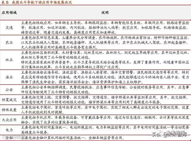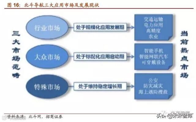 就国内而言,北斗系统的下游应用市场主要分为行业市场、大众市场、特殊市场三大应 用市场。自北斗系统提供服务以来,目前已在交通运输、农林渔业、水文监测、气象测报、通信授时、电力调度、救灾减灾、公共安全等领域得到广泛应用,服务国家重要基 础设施,产生了显著的经济效益和社会效益。