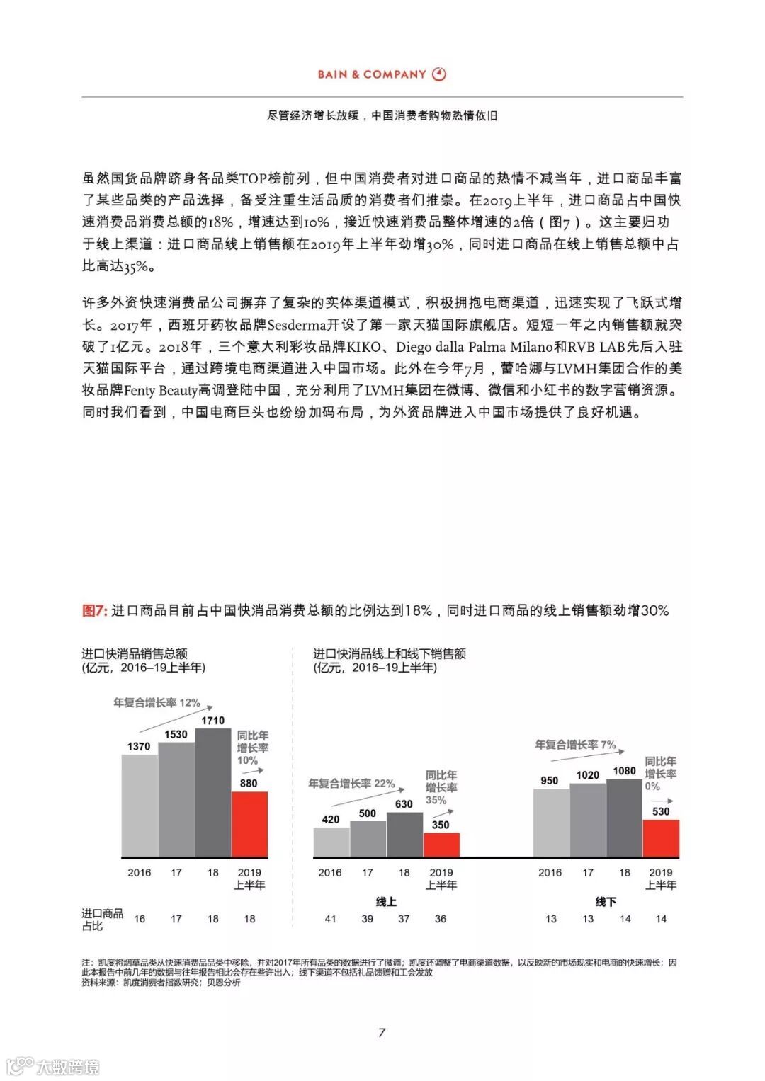 在2019年上半年,中国进口商品销售额的增速达到10%,为快速消费品整体增速的近2倍。增长主要来自线上:进口商品的线上销售额在2019年上半年劲增30%,占线上销售总额的35%。