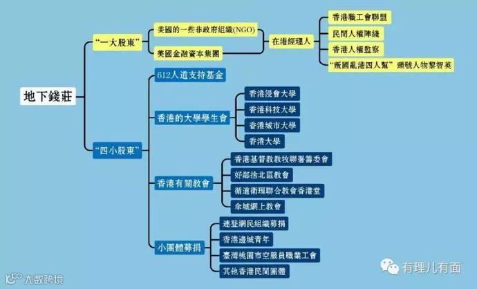 这个“地下钱庄”就是美西方反华势力、香港本土反对派势力祸港乱港的金库。其股权关系复杂,具体讲,主要有“一大四小”五个“股东”。