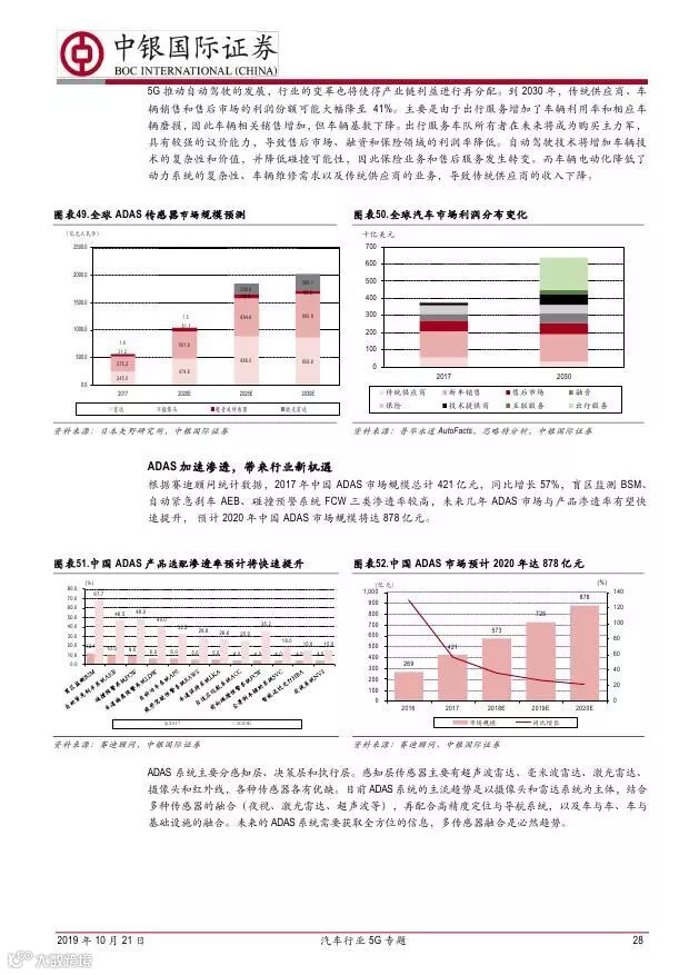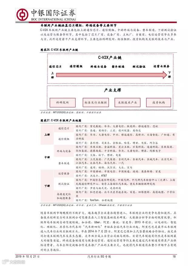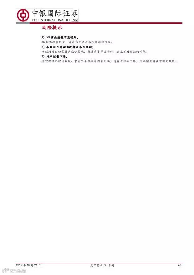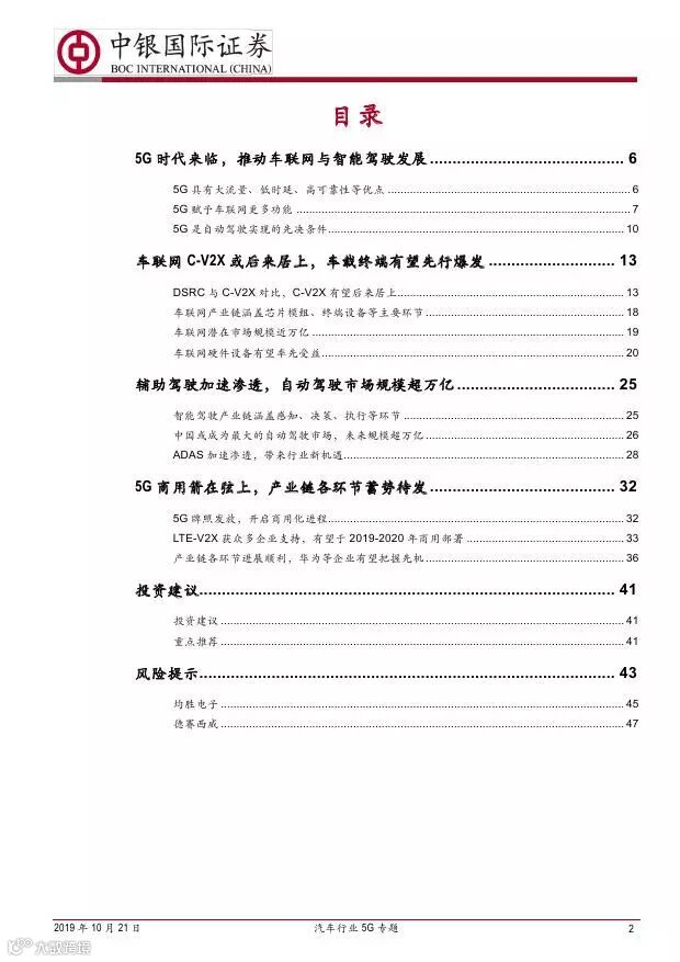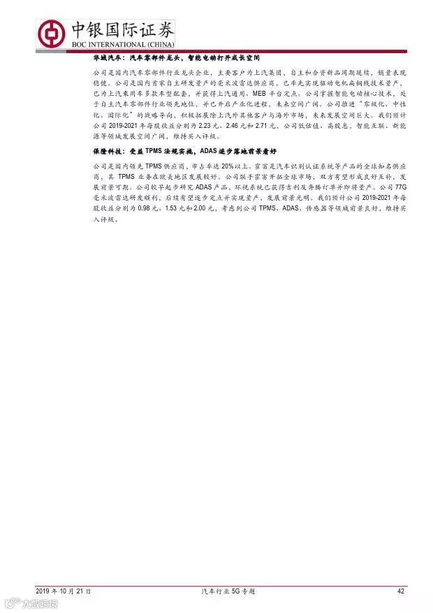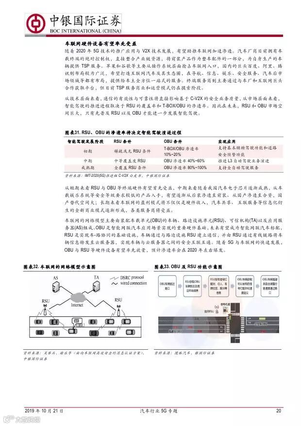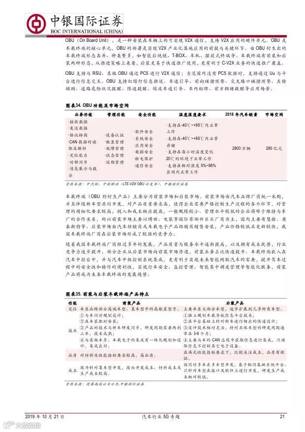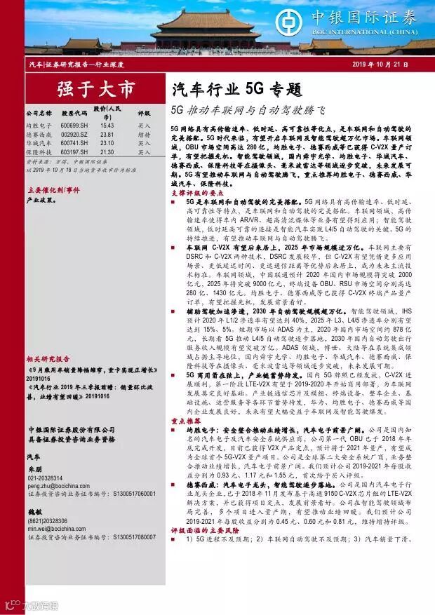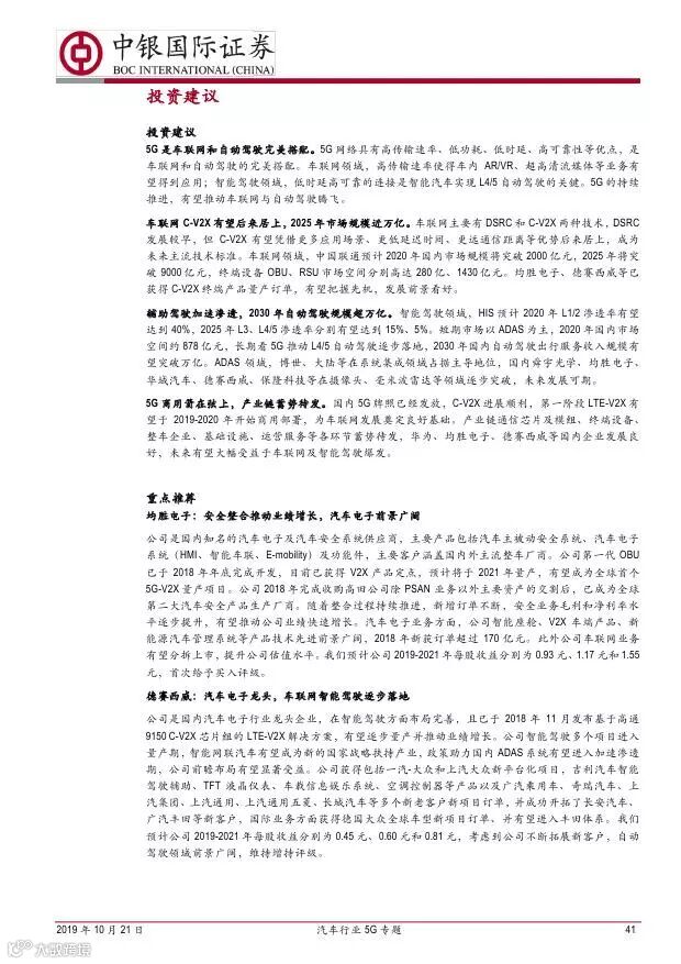 车联网领域,OBU 市场空间高达280 亿,均胜电子、德赛西威等已获得C-V2X 量产订单,有望把握先机。智能驾驶领域,国内舜宇光学、均胜电子、华域汽车、德赛西威、保隆科技等在摄像头、毫米波雷达等领域逐步突破,未来发展可期。5G 有望推动车联网与自动驾驶腾飞,重点推荐均胜电子、德赛西威、华域汽车、保隆科技。