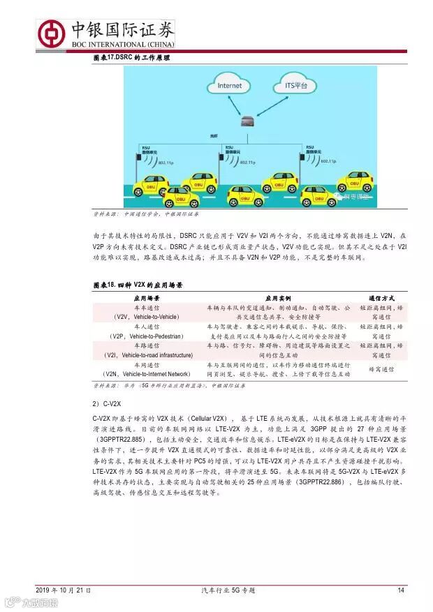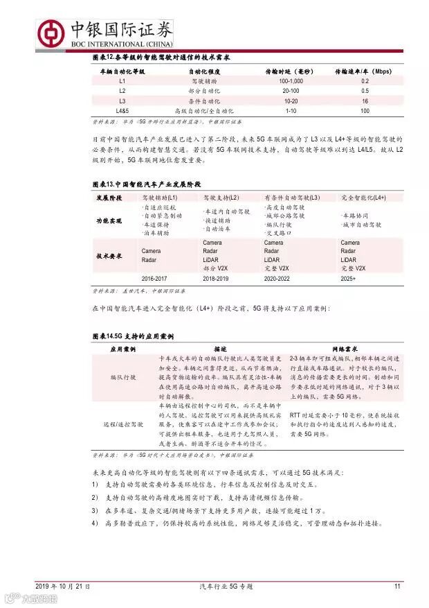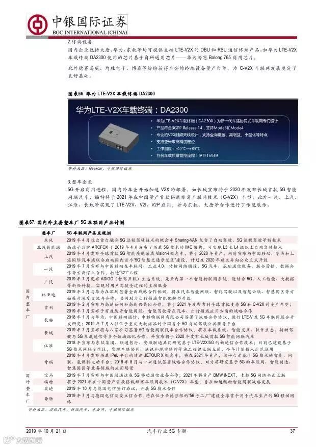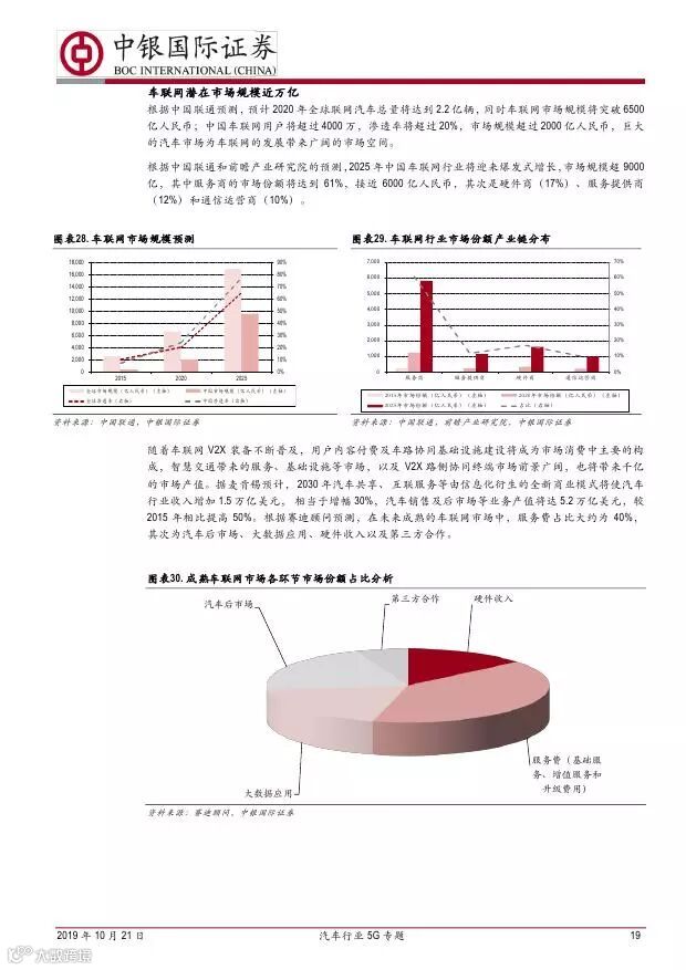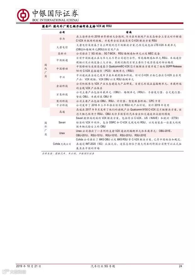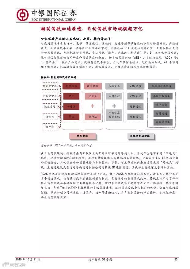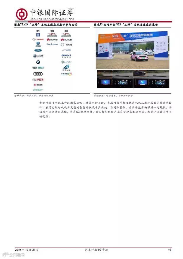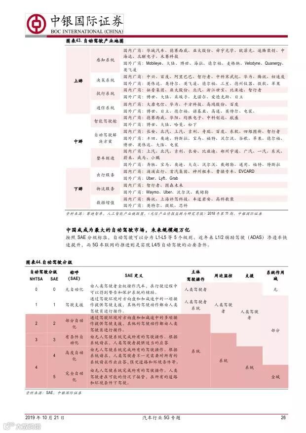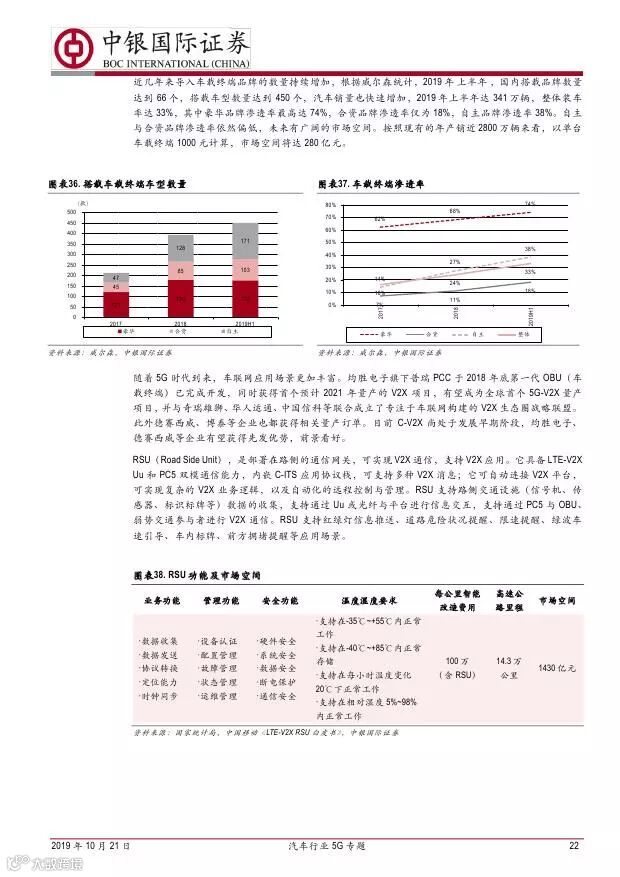 车联网领域,OBU 市场空间高达280 亿,均胜电子、德赛西威等已获得C-V2X 量产订单,有望把握先机。智能驾驶领域,国内舜宇光学、均胜电子、华域汽车、德赛西威、保隆科技等在摄像头、毫米波雷达等领域逐步突破,未来发展可期。5G 有望推动车联网与自动驾驶腾飞,重点推荐均胜电子、德赛西威、华域汽车、保隆科技。