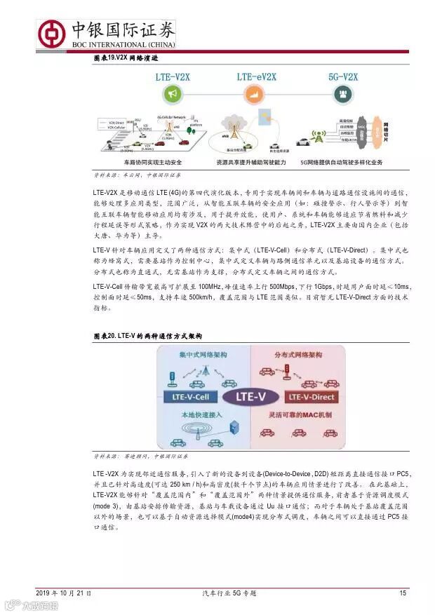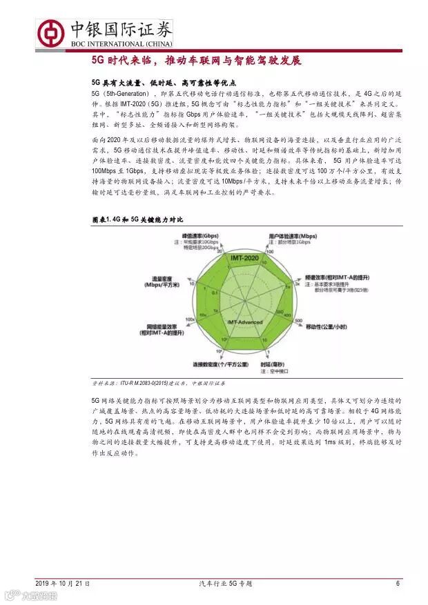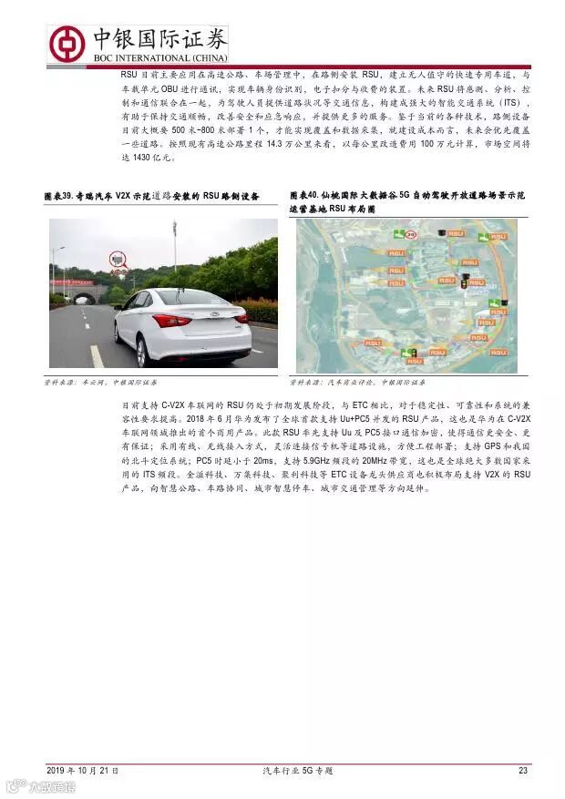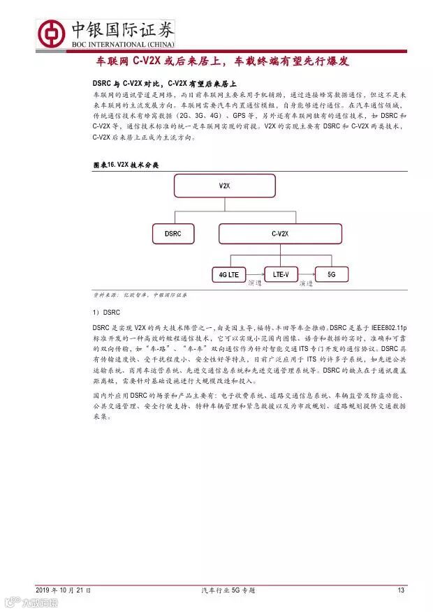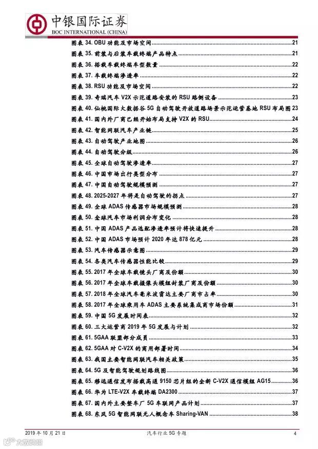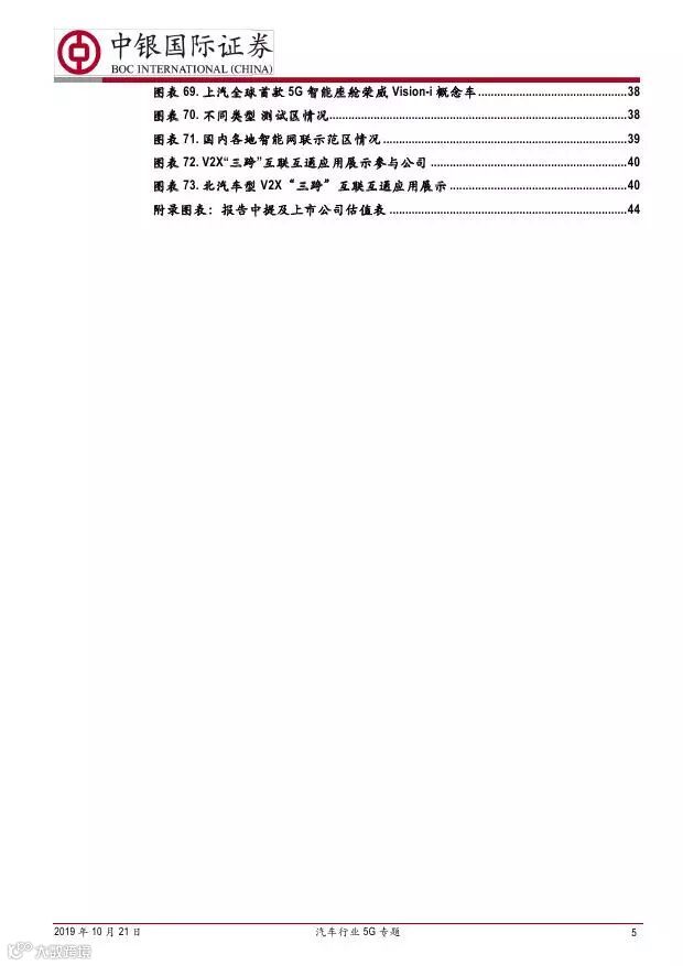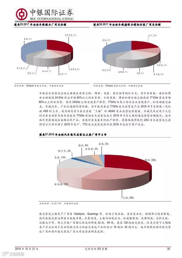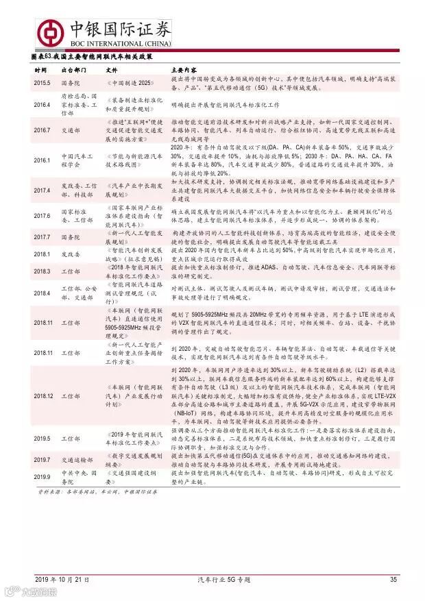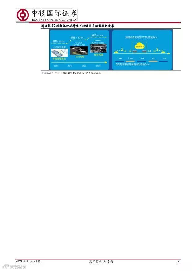 车联网领域,OBU 市场空间高达280 亿,均胜电子、德赛西威等已获得C-V2X 量产订单,有望把握先机。智能驾驶领域,国内舜宇光学、均胜电子、华域汽车、德赛西威、保隆科技等在摄像头、毫米波雷达等领域逐步突破,未来发展可期。5G 有望推动车联网与自动驾驶腾飞,重点推荐均胜电子、德赛西威、华域汽车、保隆科技。