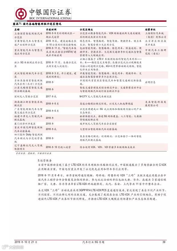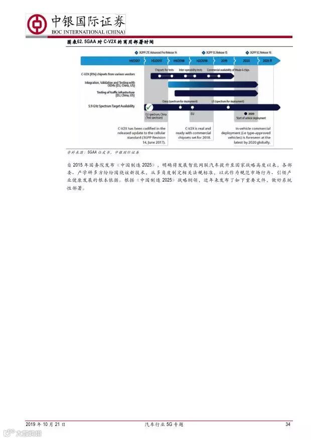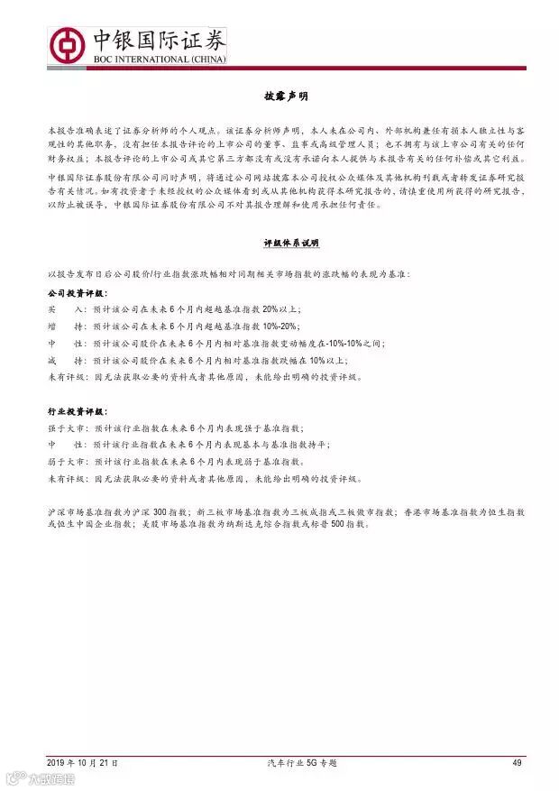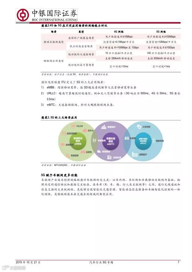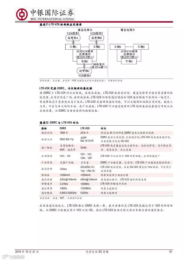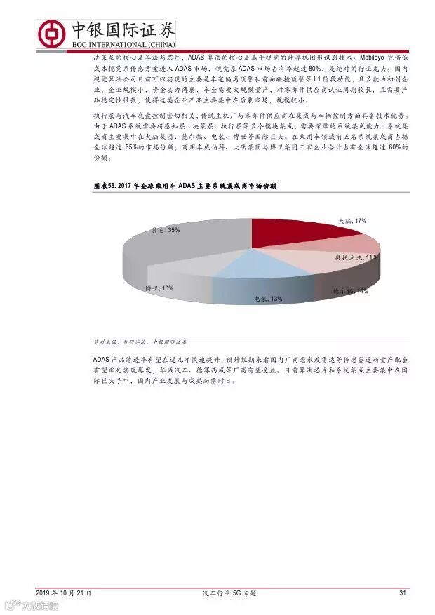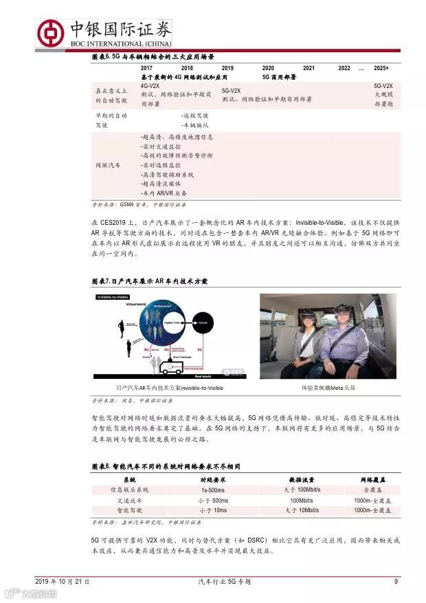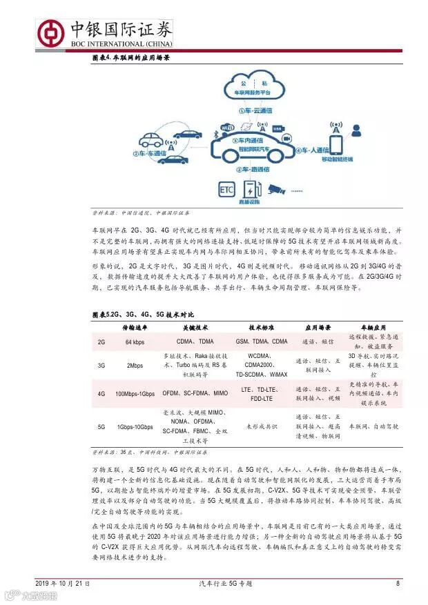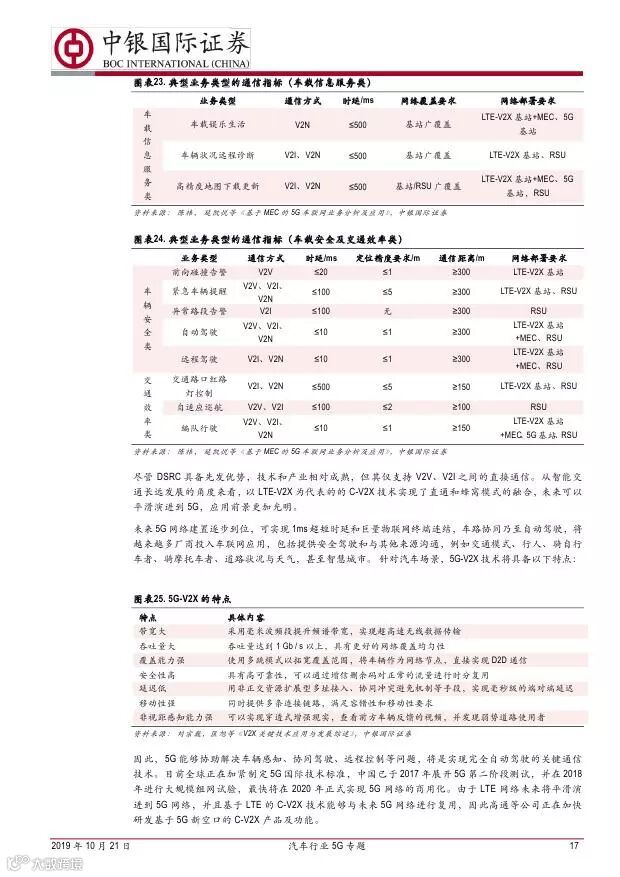车联网领域,OBU 市场空间高达280 亿,均胜电子、德赛西威等已获得C-V2X 量产订单,有望把握先机。智能驾驶领域,国内舜宇光学、均胜电子、华域汽车、德赛西威、保隆科技等在摄像头、毫米波雷达等领域逐步突破,未来发展可期。5G 有望推动车联网与自动驾驶腾飞,重点推荐均胜电子、德赛西威、华域汽车、保隆科技。