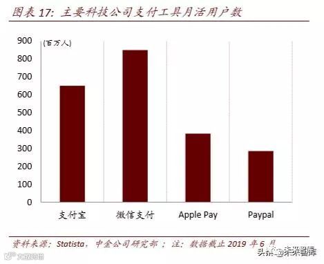 ► 业务创新能力(Activities): 互联网公司具有较强的业务创新能力,在发展新兴业务 时拥有较强的业务扩张能力和变现能力。以微信支付为例,2013 年 8 月微信支付正 式上线,截至 2Q18 时月活即达到 8 亿。据艾瑞咨询数据,1Q19 中国第三方移动支 付市场,支付宝、微信支付分别占据 53.8%、39.9%的份额,而银联的份额仅 0.4%。